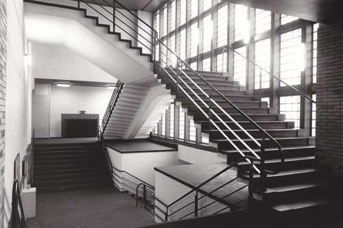 zwischen den scharfkantigen Lisenen betont. Die Lisenen geben einen emporstrebenden Kontrast zu den horizontalen Fenstern der Halle. Auch der auf rechteckigem