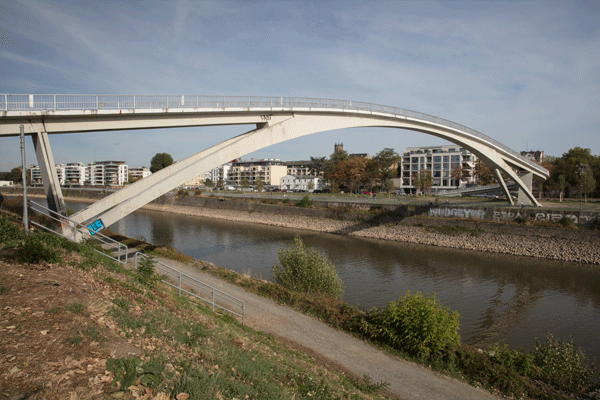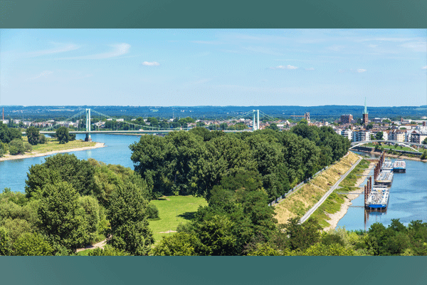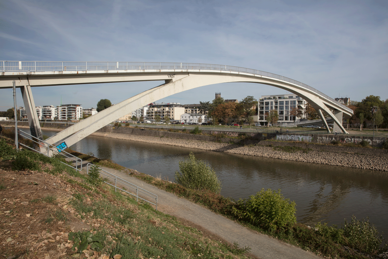 1957 verband man Mülheim durch eine elegante, hoch aufgeschwungene Spannbetonbrücke über die Hafeneinfahrt mit der Deutzer Aue.
