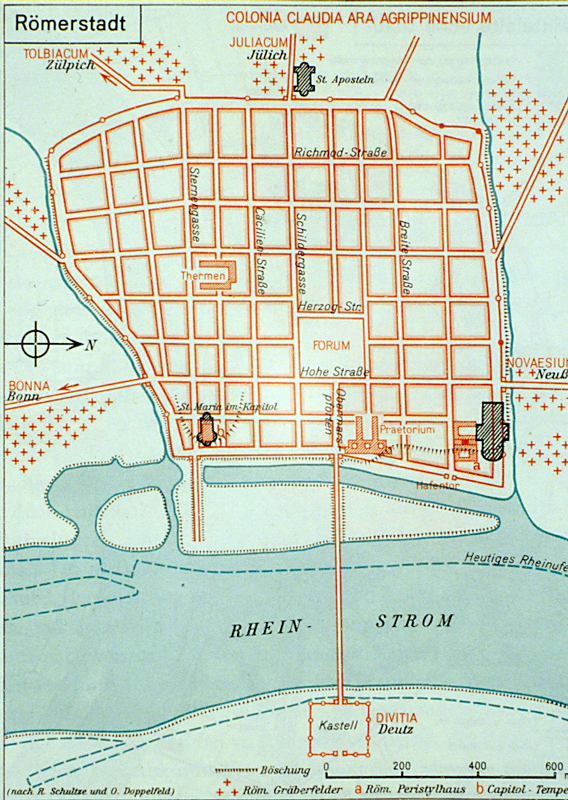 Die ummauerte römische Colonia entstand auf dem Hochufer über dem Rhein; davor befanden sich Kaianlagen und eine unbefestigte Insel. Der etwa auf Höhe von Alter Markt und Heumarkt gelegene Rheinarm zwischen Ufer und Insel versandete zunehmend und wurde später zugeschüttet, so dass in hochmittelalterlicher Zeit auf der einst vorgelagerten Insel ein neues Kaufmannsviertel angelegt werden konnte.