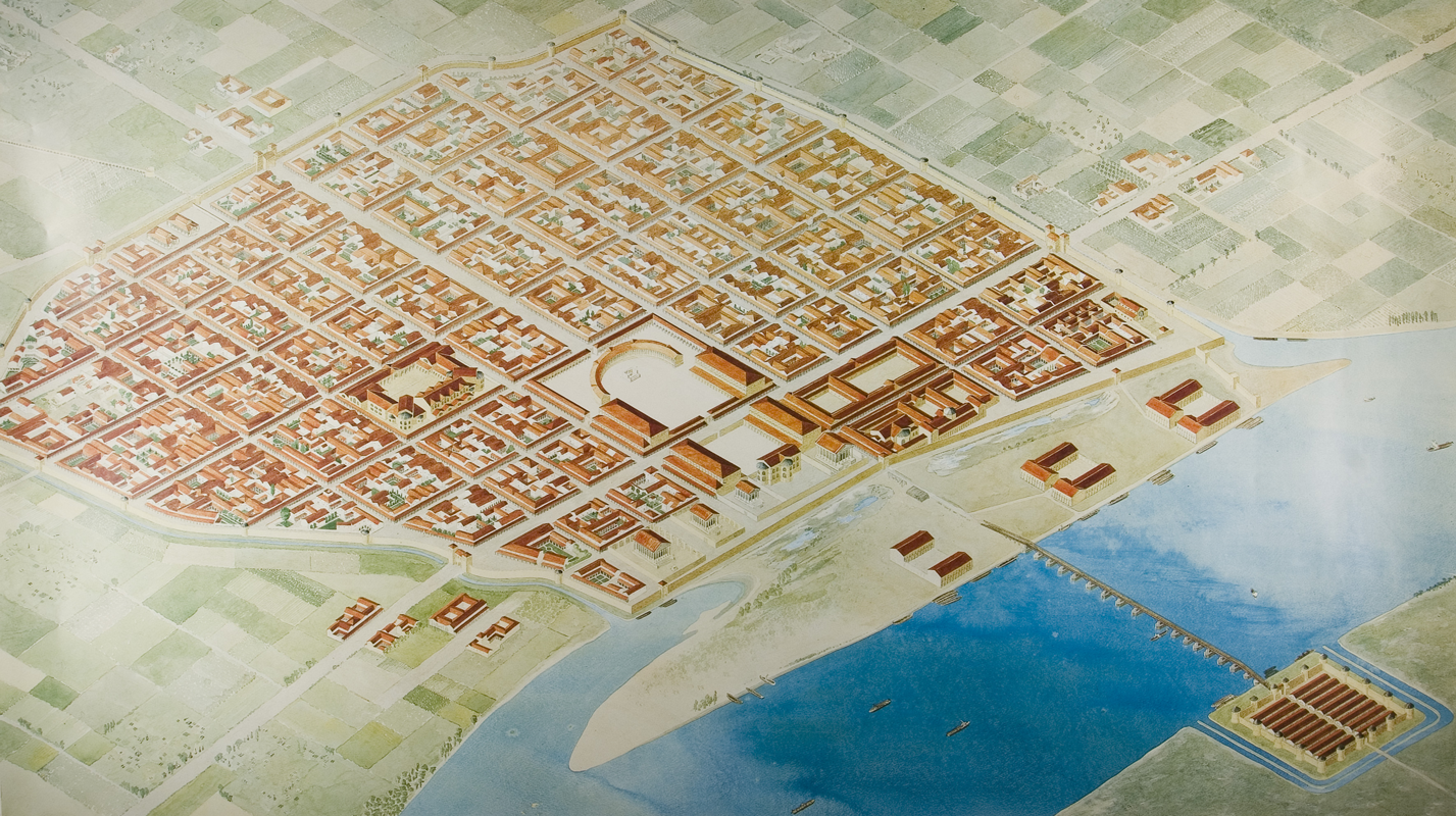 Das römische Köln. Perspektive aus der Vogelschau mit der bereits weitgehend verlandeten Hafenrinne, den Speicherbauten auf der Rheininsel und dem nun direkt im Flußbett liegenden Hafen