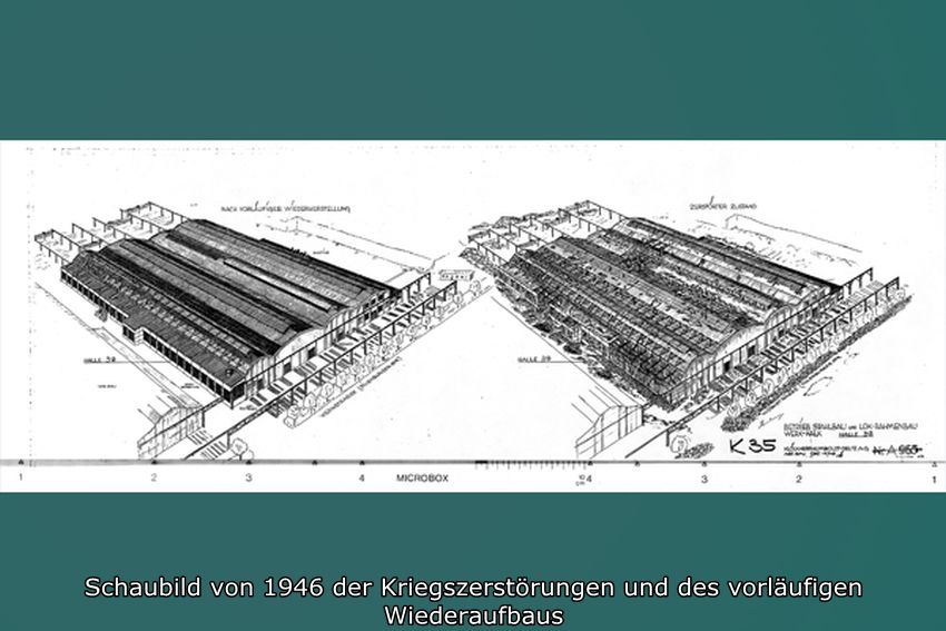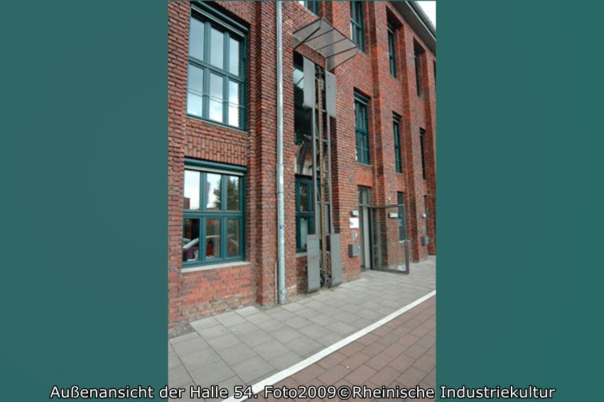 Auch die parallel angefügte Halle im Norden von 1953 hat an drei Seiten schlicht ausgebildete Backsteinfassaden. Im Inneren wird die Halle überspannt von trapezförmigen Stahlbindern mit Belichtungs- und Belüftungsaufsatz über dem First. (Walter Buschmann)