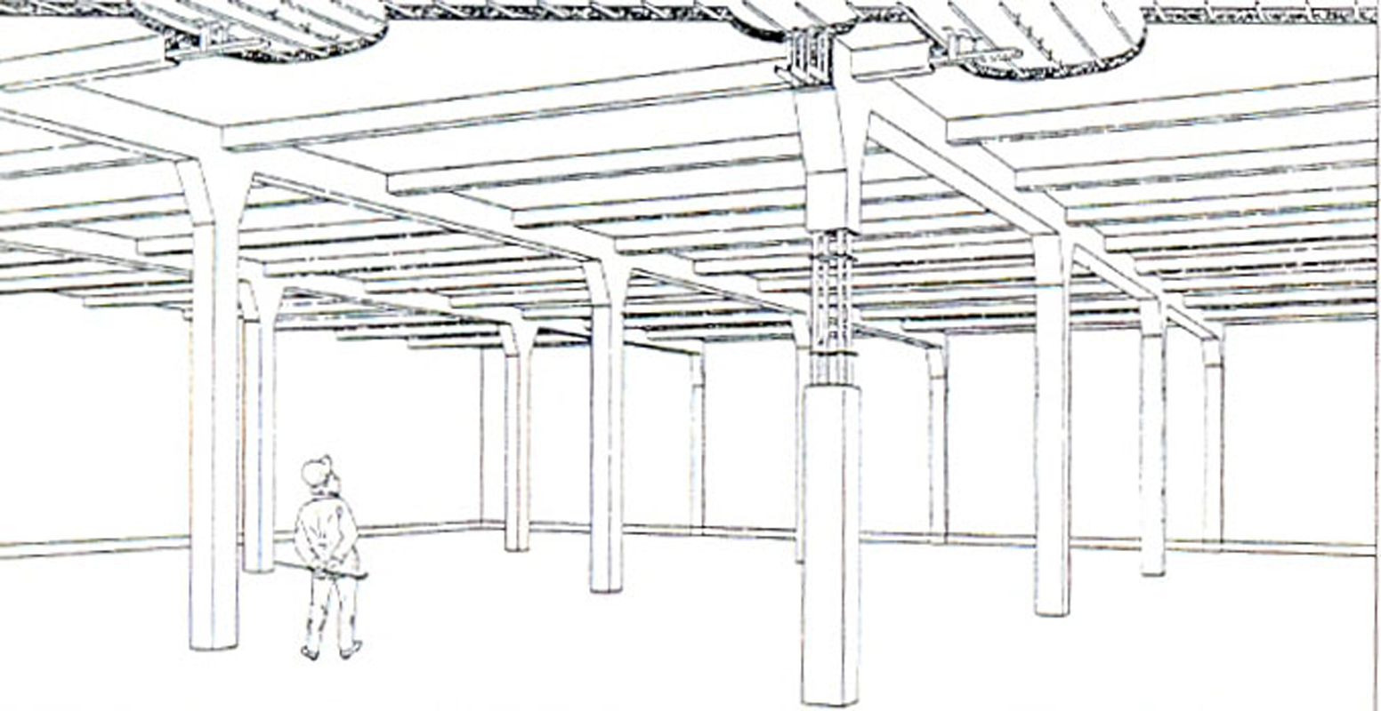Die Stahlbetonkonstruktion gleicht dem um 1890 entwickelten System Hennebique. Entsprechend der statischen Belastung sind die Stützen im Erdgeschoß kräftiger ausgebildet auf Achteckgrundriss, während die Stützen in den Obergeschossen quadratische Querschnitte haben. An die Stützen sind die Unterzüge mit kopfbandartigen Verstärkungen im Stützenbereich ausgebildet. Es gibt stärkere Haupt- und schwächere Nebenunterzüge.