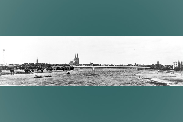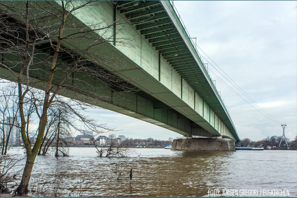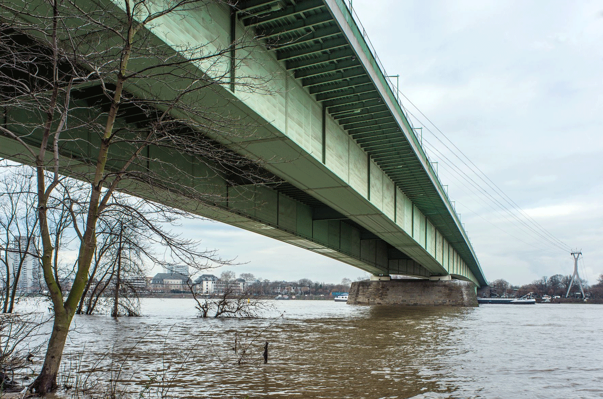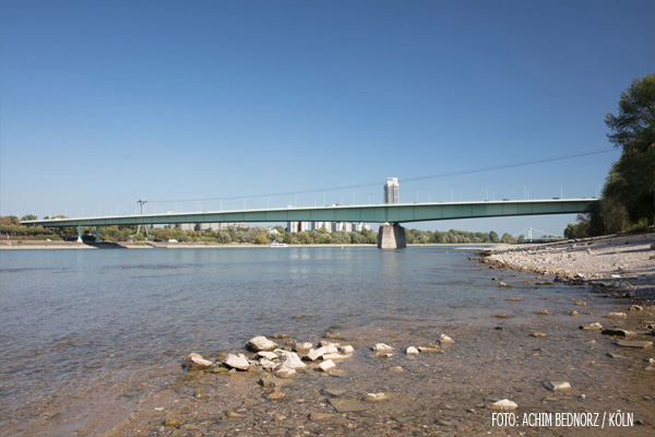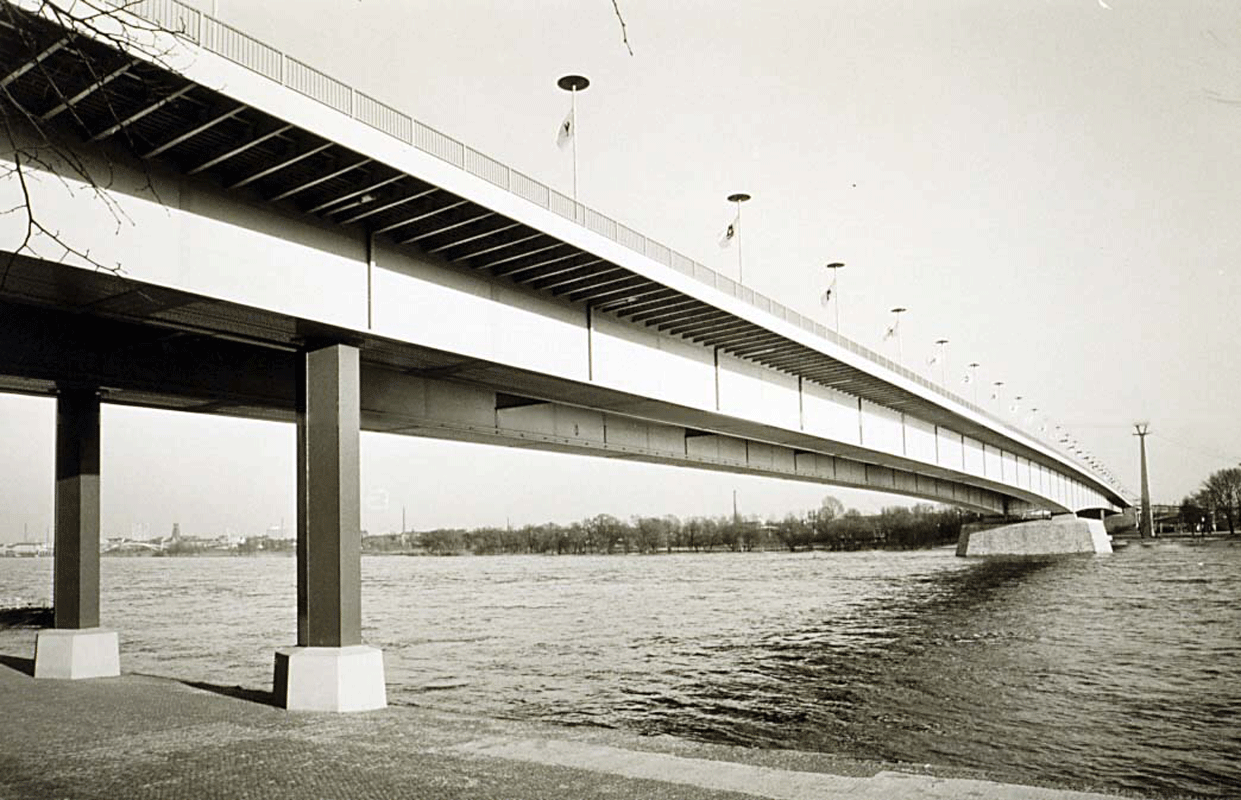 1962 wurden nach einem Wettbewerb Fritz Leonhardt als Tragwerksplaner und Gert Lohmer als Architekt der Brücke ausgewählt. Sie errichteten 1962-65 eine im typischen Kölner Brückengrün gestrichene Balkenbrücke mit nur einem, nahe dem rechten Ufer asymmetrisch im Strom angeordneten Pfeiler. Von dort beträgt die Spannweite bis zu den beiden Stahlstützen am Westufer 259 m. Ein zweizelliger Kasten unter der ebenfalls zur Tragfunktion beitragenden Fahrbahn (eine mit Doppel-T-Trägern versteifte (orthotrope) Platte mit 12–26mm Stahlblech und 6cm Gussasphalt) sorgte für die notwendige Stabilität.