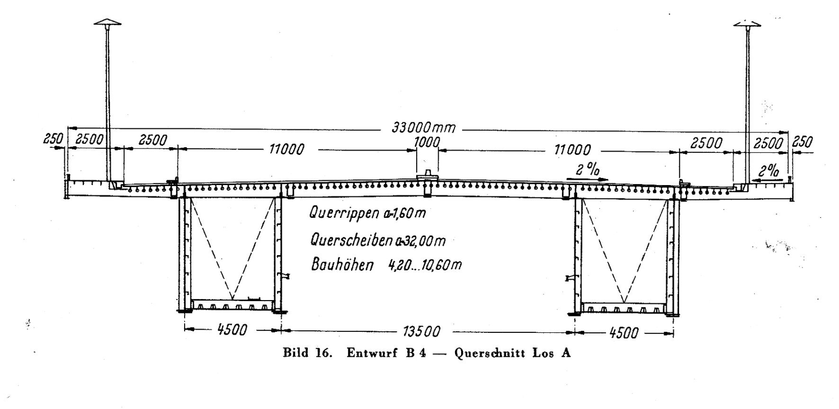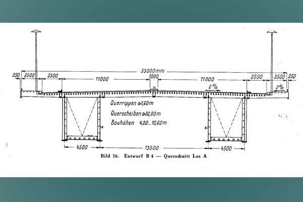Schnitt mit den beiden Kastenträgern und der als orthotropen Platte ausgebildeten Fahrbahn