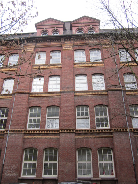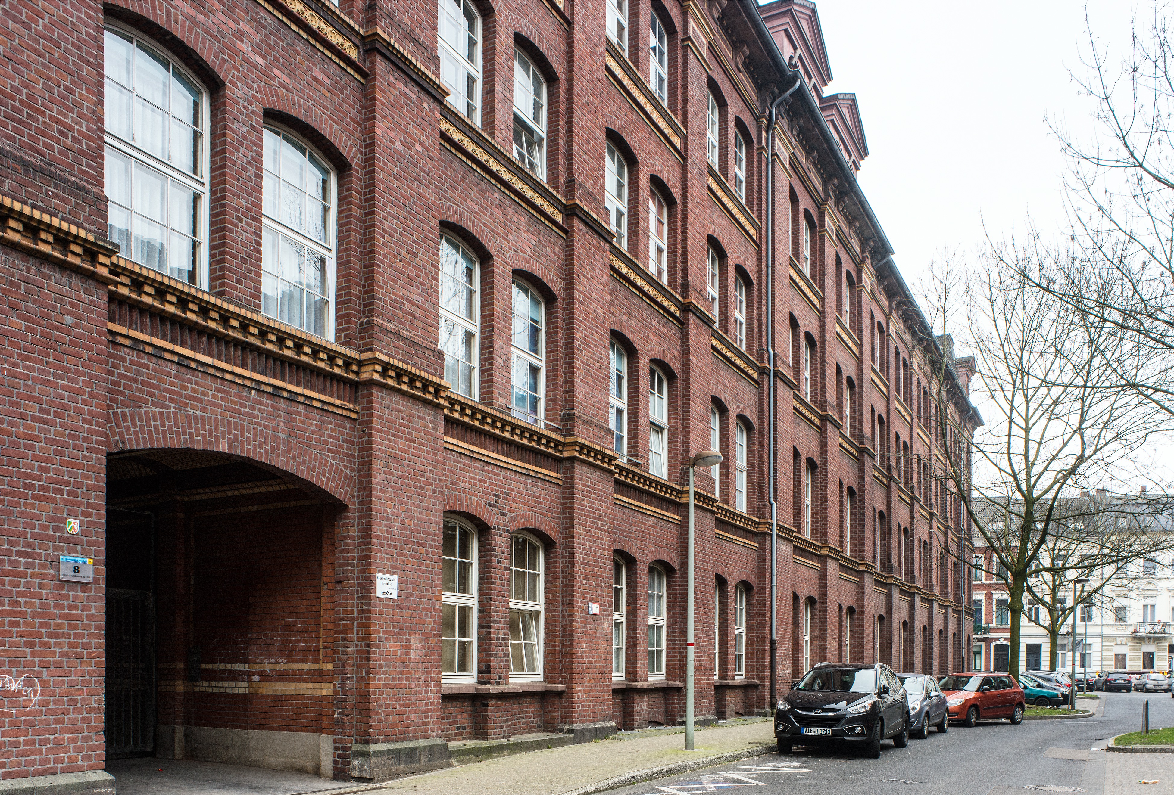 Die historische Schauzeichnung zeigt entlang der Melanchthonstraße einen langgestreckten, ebenfalls ziegelsichtigen Flügelbau, der in regelmäßigen Abständen durch einen Pavillon überhöht und offenbar ebenfalls in regelmäßige Segmente gegliedert war. Dahinter vervollständigten Shedhallen die Fabrikanlage zu einer flächendeckenden, rechtwinkligen Struktur.