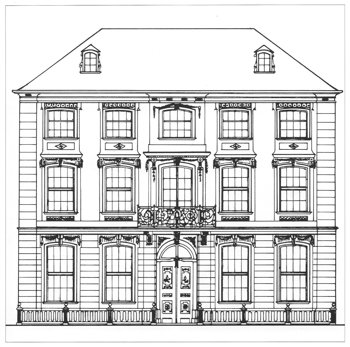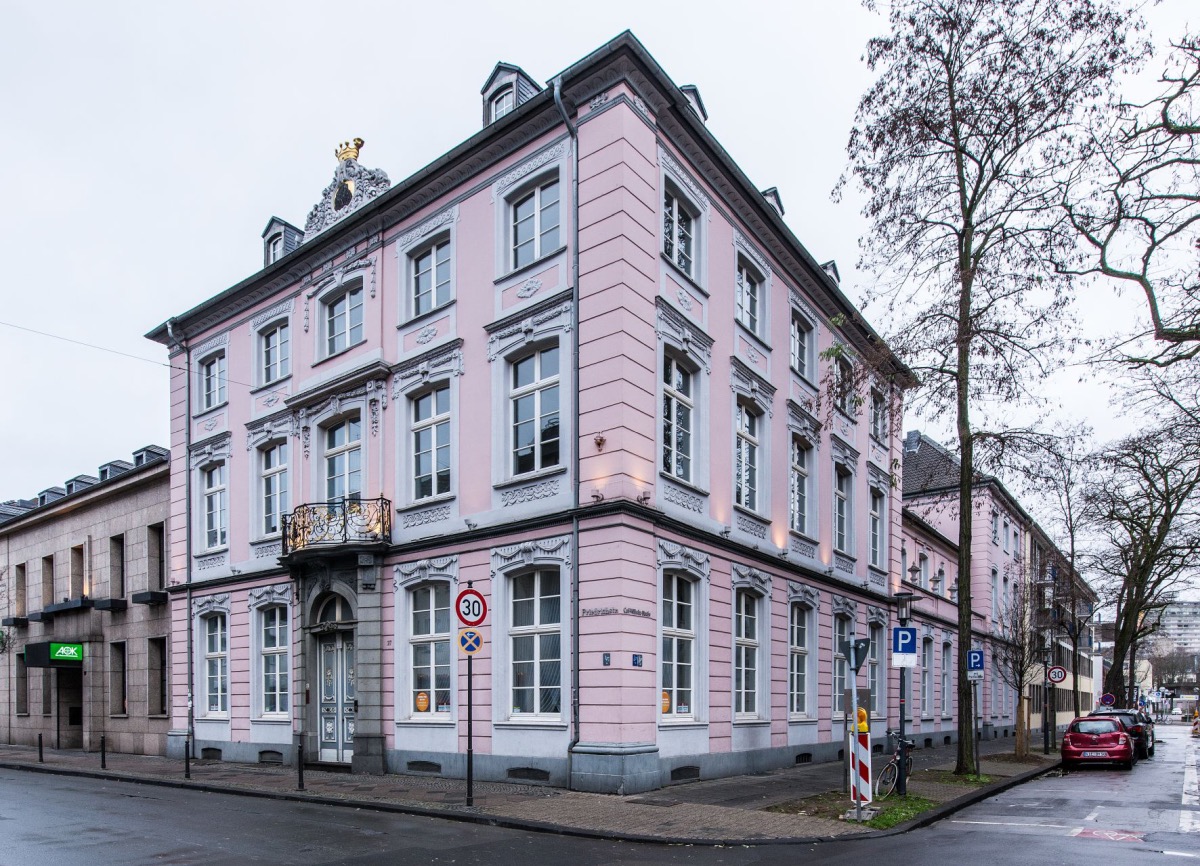 Die zu beiden Straßenseiten fünfachsig angelegten Fassaden wurden bei der Fronterneuerung von 1777-81 mit einem Stuck-Putz ausgestattet. Das Erdgeschoss ist klassizistischer Manier folgend mit einem Bänderputz überzogen und nimmt zur Friedrichstraße hin den Haupteingang in der als Risalit betonten Mittelachse auf. Schräg aufgestellte Pilaster rahmen das hausteinerne Rundbogenportal, über dem der von Konsolen unterfangene Balkon der Beletage als kleines Portaldach fungiert. Für die Fassadengestaltung bediente sich Leydel der für die Zeit aktuellen Louis-Seize-Dekoration, indem er die geschossweise in der Höhe abgestuften Segmentbogenfenster und Brüstungsspiegel mit Traperien, Festons, Girlanden und Keilsteindekor ausstattete. Ein schmiedeeisernes Gitter mit geschwungenen Ranken und Akanthusblättern belebt den Portalaufbau. In der von traufhohen Eckpilastern gerahmten Fassade bilden das auskragende Geschossgesims und die Sturzgebälke der Obergeschossfenster horizontale Akzente. Über dem dunkelgrauen Putzsockel ist die Fassade rosé gefasst, und die Fenster sind in hellgrau abgesetzt. Ein weiter Dachüberstand markiert den Ansatz des gebrochenen Pyramidendaches. Die Dachhäuschen entsprechen, soweit es die überlieferte Fassadenansicht zeigt (Dautermann 2017, S. 61, Abb. 12), dem bauzeitlichen Konzept. Der Mittelrisalit ist mit einer reich ausgestalteten Schildkartusche bekrönt, die das mit einer Krone ausgezeichnete Wappen der Familie von der Leyen aufnimmt. Rückwärtig schließt ein zweigeschossiges Nebengebäude an, das in reduzierter Form den Fassadendekor fortschreibt.