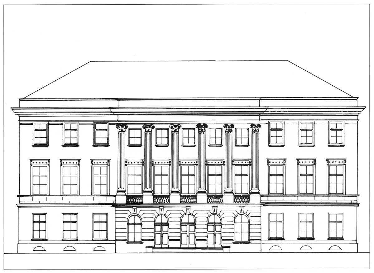 Michael Leydel verstarb bereits 1782 im Alter von nur 33 Jahren. Sein ebenfalls als Architekt ausgebildeter Bruder Martin zog nach Krefeld, übernahm die Geschäfte seines Bruders und fand damit auch den Zugang zu Auftraggebern wie Conrad von der Leyen. An der Autorenschaft Martin Leydels am Stadtpalais-Entwurf bestehen allerdings für Clara Bettina Schmidt Zweifel, da große Übereinstimmungen zum Brüsseler Conseil de Brabant bestehen, an dessen Planung Michael Leydel ab 1778 beteiligt war (Schmidt 1997, S. 83-84). Das für diesen entworfene dreigeschossige Stadtpalais erhielt im architektonischen Aufbau eine deutliche Zweiteilung, indem Leydel über einem durch Bänderputz rustiziert anmutenden Sockelgeschoss den beiden aufgehenden Geschossen eine glatt verputzte helle Fassadenfläche gab. Die Fenster der Beletage erhielten ein kräftiges Sturzgebälk, die des Obergeschosses dagegen nur eine schlichte Rahmung. Die durch den französischen Klassizismus geprägte Fassade bot die Folie für einen Portikus mit palladianischen Zügen. In Kolossalordnung nehmen sechs ionische Säulen einen faszierten Architrav auf. Ein weit ausladendes, umlaufendes Kranzgesims mit Attika bildet den oberen Dachabschluss, hinter dem. das flache Walmdach kaum sichtbar ist. Während der Bau heute in die Platzanlage eingebunden ist und sich sein Zugang nur wenig über die Platzfläche erhebt, führte ursprünglich eine Stufenanlage zum Portikus mit seinen fünf rundbogigen Öffnungen hoch. Ursprünglich waren nur die drei mittleren als Tür angelegt, rechts und links begleitet von je einem rundbogigen Fenster.