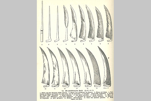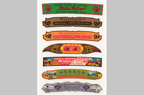 Die Handelsnamen für die Produkte prägten die Nachfrage deutlich mit. Aufschriften auf den Sensen waren Geschmack und Erwartungen des jeweiligen Kundenkreises angepasst. So las man beispielsweise "Hoch den Deutschen in Amerika" auf Sensen, die nach Amerika exportiert wurden, oder auf Sensen, die in die Niederlande gingen, einen Text, der wohl altdeutsch oder niederländisch anmuten soll: "Ganz gegoten englisch Stahl".