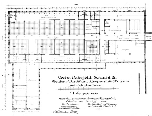 Zum Förderturm orientiert, befanden sich in der Halle noch die Lampenstube und das Magazin mit darüber angeordneten Steigerbädern. Von dort aus führte ein Gang zum Schacht.