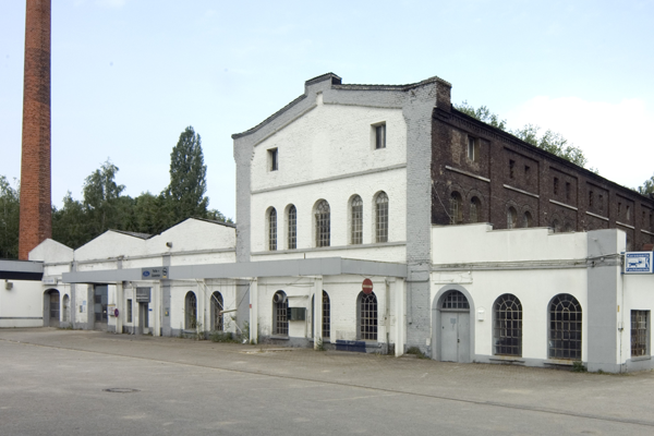 Zurückgesetzt vom Hauser Ring, der früheren Hauser Allee liegen die erhaltenen Fabrikbauten direkt am Angerbach. Der in Backstein 1850-53 erstellte Hauptbau erhebt sich auf L-förmigem Grundriss mit einem dreigeschossigen Haupttrakt der rechtwinklig zum Bach angeordnet ist und einem zweigeschossigen, parallel zum Bach liegenden Quertrakt. Historische Karten und Pläne zeigen, dass der Haupttrakt mit einem quer durch den Bach reichenden Wehr verbunden war(5). Das Wehr ist ansatzweise am Gebäude noch erkennbar, ebenso wie eine anschließende Öffnung, die vermutlich mit dem Wasserantrieb zu tun hatte. In den Fluss hinein ragte ein heute nicht mehr existenter Anbau, möglicherweise zur Einhausung des Wasserrades. Auch die über den Fluss führende Brücke ist auf alten Plänen und Karten stets eingezeichnet(6).