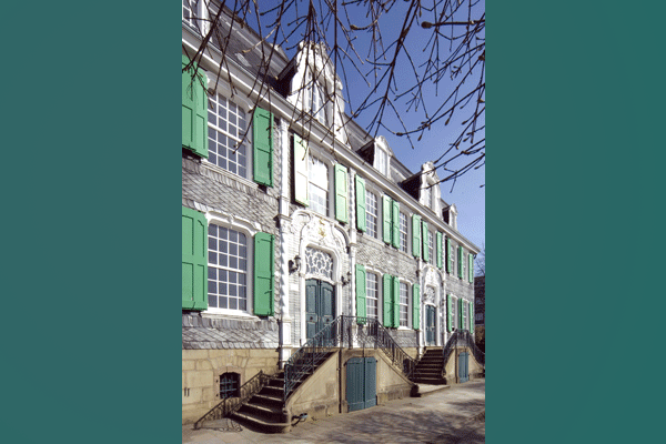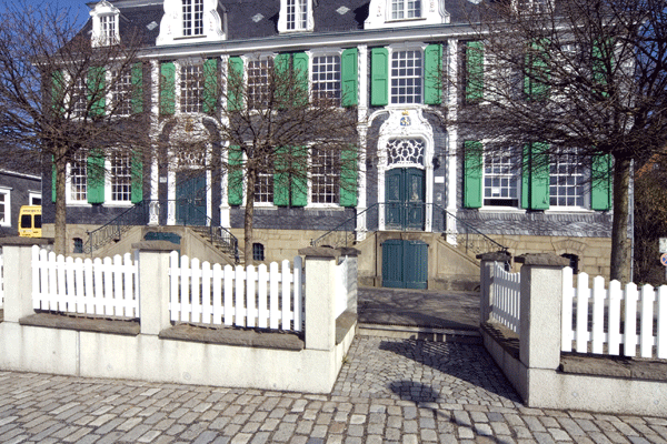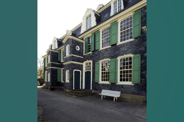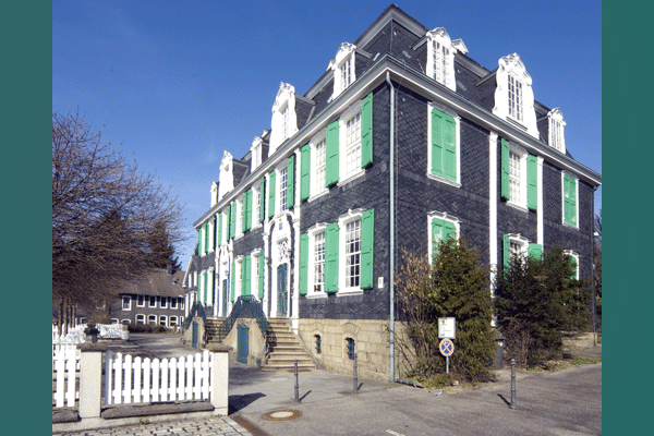 Alle Fenster und Gauben sind mit profiliertem Rahmenwerk und Blendläden versehen. Die Fenster der Hauptgeschosse zeigen mittig im Sturz Zierrahmen und geschnitzte, arabeskenartige Rocaille- und Blumenmotive. Gliedernde und schmückende Fassadenelemente ebenso wie die kleinteiligen Schiebefenster mit je 24 Glasscheiben in den Hauptgeschossen sowie die Flügelfenster in den Gauben mit Umrahmungen und Überdachungen heben sich gegen den dunklen, blaugrauen Grundton der Schieferbekleidung durch weißen Anstrich kräftig ab. Die Blendläden sind grün, die Türen dunkelgrün gestrichen. Zum Farbkanon trägt das blasse Gelb des Sockelgeschosses und der Freitreppen verhalten bei.
