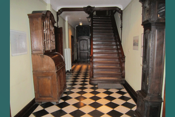 Zur hausfesten Ausstattung gehören in beiden Häusern die an den Treppenpfosten reich mit Schnitzereien in Rokokoformen verzierten Treppen mit geschlossenen, profilierten Brüstungstafeln. In beiden Eingangsbereichen werden die Treppenaugen im Erdgeschoß von einem profilierten und geschweiften Sturzbalken begrenzt, der sich an den Wänden in geschnitzten, pilasterartigen Wandpfosten fortsetzt. In der Mitte des Balkens befinden sich in beiden Häusern geschnitzte Adlerfiguren. In Eingangsbereichen bestehen die Fußböden aus schwarzen und weißen Fußbodenplatten aus Marmor im Diagonalverband(teilerneuert im Haus 2). Die Salons, Wohn- und Schlafräume haben teilweise erneuerte, teilweise mit Teppich überdeckte Fußböden aus Eichendielen. In den Türöffnungen sind überwiegend die verzierten Eichentüren mit Messingbeschlägen und die zugehörigen profilierten und mit Schnitzereien versehenen Türumrahmungen erhalten.