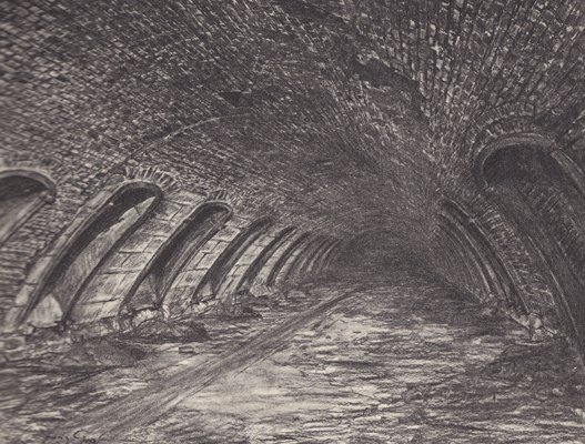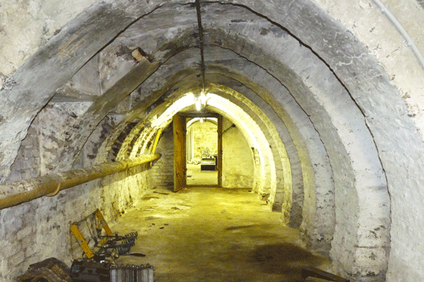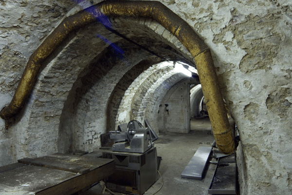 Unter der Halle der Tiegelschmelze der Fa. Mannesmann in Bliedinghausen sind zwei Gewölbe erhalten, die mit großer Wahrscheinlichkeit auf die Tiegelschmelze von 1858 zurückgehen. Beide Gewölbe wurden später zu Luftschutzzwecken mit Zwischenwänden und schweren Stahltüren umgebaut. Das Ostgewölbe hat eine Länge von 22,10m, ist 2,24-3,36m breit, etwa 2,0m hoch und wird im Kernbereich durch Rippen gegliedert. An der Westseite des Gewölbes reichen Nischen, so wie für englische Tiegelofenanlagen beschrieben, bis auf das Fußbodenniveau des Kellers. Es handelt sich um sieben Nischen vor und weitere fünf Nischen hinter einer Trennwand mit Stahltür. Auf der Ostseite sind ebenfalls Nischen eingelassen. Diese Nischen enden aber auf einer Höhe von etwa 1,2m über dem Kellerboden. Das Westgewölbe hat keine Rippengliederung. An der Westseite des Gewölbes sind Nischen erkennbar: acht vor und sieben hinter einer Trennwand. Beide Gewölbe sind in Ziegelmauerwerk gemauert.