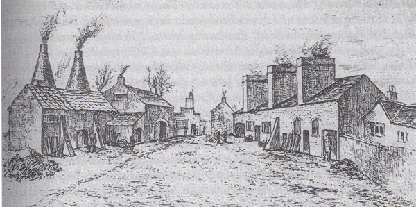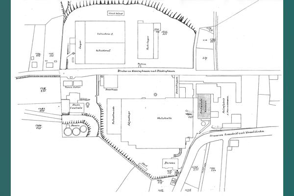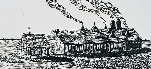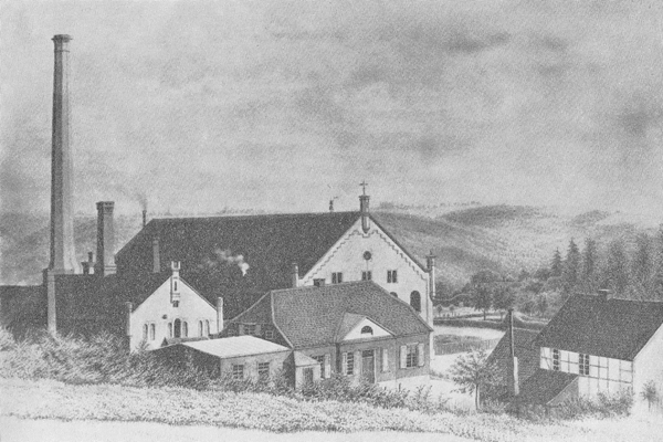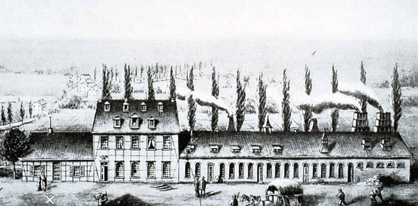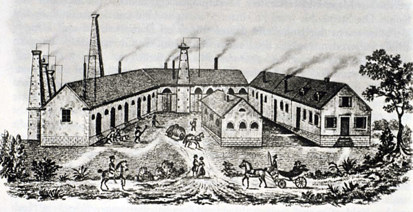 Schmelzbau um 1845. Bochumer Verein. Quelle: Walther Däbritz: Bochumer Verein für Bergbau und Gusstahlfabrikation in Bochum. Neun Jahrzehnte seiner Geschichte im Rahmen der Wirtschaft des Ruhrbezirks. Verlag Stahleisen, Düsseldorf 1934.