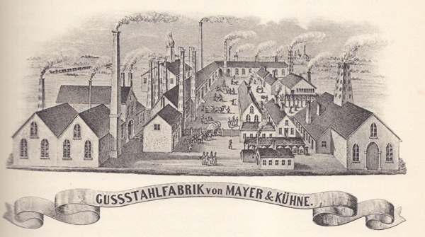 Vergleichbar war die Entwicklung der Gußstahlfabrik Meyer & Kühne. Das Werk entstand 1843-45 und bildete anfangs einen nach der Essener Chaussee hin offenes Viereck. Links lag die Tiegelschmelze, kenntlich durch die größere Anzahl von Schornsteinen für die Tiegelöfen. Rechts war das Zementierstahlwerk angeordnet mit einem zentral im Firstbereich aus dem Gebäude herausragenden Einzelkamin. Im nördlichen Verbindungsflügel waren Schmiede, Schlosserei, Dreherei und Feilenhärterei untergebracht. Im Hof sind Stein- und Tiegelformerei sowie Lager- und Werkstattgebäude erkennbar. 1853 kam das Walzwerk am linken Bildrand dazu. Die hofförmige Anordnung der Gebäude folgte einem in der Frühzeit der Industriealisierung immer wieder erkennbaren Schema. Die spitzbogigen Fenster- und Türöffnungen zeigen verhalten neugotische Formen. Interessant ist die in einer späteren Erweiterung realisierte Verbindung von Tiegelöfen und Dampferzeugung. Die Wasserkessel waren dicht neben den Tiegelöfen angeordnet, so dass die heißen Gase an den Kesseln entlang streichen und das darin enthaltene Wasser erhitzten. Diese Anordnung wurde auch in Remscheid-Bliedinghausen gewählt.