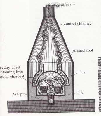 Der Ofenraum war also eine vergleichsweise kleine, schachtartige Kammer mit einem Rost für den oder die Tiegel. Die Tiegel waren mit dem Brennmaterial Koks umgeben, das nach Entzündung mehrfach alle 30 bis 60 Minuten nachgefüllt werden musste. Nach 3 bis 4 Stunden Brennzeit konnten die Tiegel aus dem Ofen herausgehoben werden.