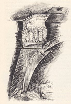 Die weitaus größten baulichen Elemente der Tiegelöfen waren über der Hüttensohle die Schornsteine und unterhalb der Öfen die Aschegewölbe. Die Schornsteine waren oft für mehrere Öfen zu Gruppen zusammengefasst und wurden als schmale, quaderförmige Körper durch die Schmelzofenhalle über das Dach hinaus geführt. Alternativ wurden die Rauchgase in einem Rauchkanal gesammelt und zentral in einem Einzelschornstein abgeführt. Die Asche aus den Öfen fiel unterhalb der Ofenroste auf den Boden eines gewölbten Kellerraumes, wurde dort auf Aschekarren geschaufelt und entsorgt. Nach englischem Muster waren den Öfen in den Gewölberäumen kleine Nischen zugeordnet, in denen sich die Asche ofenweise sammelte.