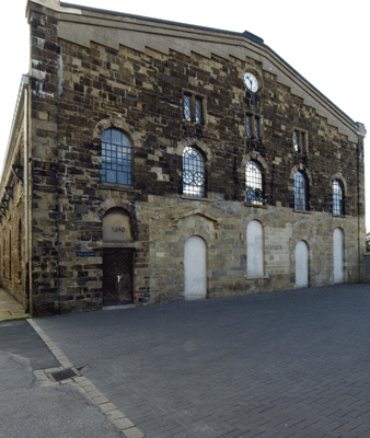 Die Fassaden der Halle sind zweigeschossig aufgebaut und spiegeln damit den mit Emporen ausgestatteten Innenraum. Den Charakter der Architektur prägen besonders die Rundbogenöffnungen für Fenster, Türen und Tore mit den in großer Zahl noch vorhandenen filigranen und ornamental geschmückten Gusseisenrahmen. Mehrere rundbogige Tür- und Toröffnungen ermöglichen den Zu- und Ausgang zur Halle. Besondere Aufmerksamkeit wurde dem straßenseitigen Giebel gewidmet, mit einem Stufenfries unter der Traufe, einer nachträglich 1869 in ein Rundfenster eingelassene Uhr im Giebeldreieck, besonders aber mit der Fensterreihe unter der Uhr. Die Rechteckfenster sind nach neugotischer Art gerahmt mit fein profilierten Hausteinlaibungen und vertikal geteilt durch senkrechte Fensterstöcke. Die verbleibenden schmalen Fensterflächen werden durch Sprossenwerk mit Rautenmuster gegliedert. Die Fenster korrespondierten mit den ebenfalls aus dem neugotischen Formrepertoire stammenden, auf allen historischen Schaubildern überlieferten, leider aber am Bauwerk nicht mehr vorhandenen Fialen am First und an den beiden Fußpunkten des Giebeldreiecks.