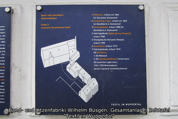 Das Firmengelände der Firma Wilhelm Büsgen ist in diesem Zusammenhang von besonderem Interesse. Hier lassen sich anhand der Gebäude die typischen Entwicklungsschritte der Wuppertaler Bandindustrie ablesen.