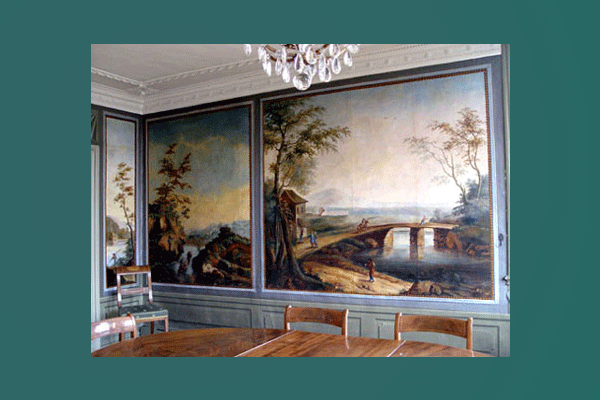 Besonders repräsentativ präsentieren sich die beiden Räume auf der rechten Seite des Obergeschosses. Farbige Ölbildertapeten, die mit gemaltem Perlstabornament eingefasst sind, zeigen auf 18 Bildern in beiden Räumen Fluss- und Küstenlandschaften. Die Sockelzone ist in Täfelungsimitation ausgemalt. Die Tapeten wurden von Wilhelm Schaaf angebracht, der zu Beginn des 19. Jahrhunderts eine Tapetenfabrik in Barmen besaß. Der Fußboden ist mit Parkett belegt. Oberer Wandabschluss, Decke, Türrahmung und Ofennische sind mit reichen Stukkaturen ausgestattet. Die Ofennische ist seitlich mit pilasterartigen Vorlagen eingefasst, die mit Scheibenornament und mit Akanthusblättern besetzt sind. Die rundbogige Ofennische schmücken ein Widderkopf, ein Lorbeerkranz und Rosenblüten. Ein gestuftes Gesims mit einem Kymafries überdeckt die rundbogige Nische. Darüber fassen pilasterartige Vorlagen, die mit Fruchtgehängen besetzt sind, ein stukkiertes Bildrelief ein. Im Hintergrund zeigt das Bild eine Pflanze, einen Merkurstab und eine brennende Fackel und im Vordergrund auf einem Sockel einen Korb, in dem zwei Tauben sitzen, die bereits vollplastisch in Erscheinung treten. Der obere Wandabschluss ist mit stukkierten Perl- und Scheibenfriesen gestaltet. Die Decke ist mit stukkierten Blüten, Schnürband und vegetabilischen Ornamenten geschmückt.